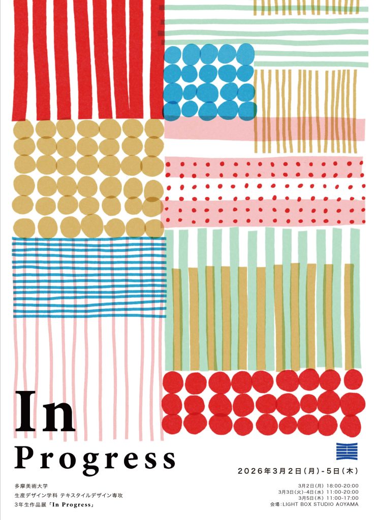 2026年3月2日(月)から3月5日(木)まで、LIGHT BOX STUDIO AOYAMA にて多摩美術大学生産デザイン学科テキスタイルデザイン専攻 3年生展「InPrgress」を開催いたします。日々の課題作品と産学共同研究の成果を展示します。是非ご高覧ください。