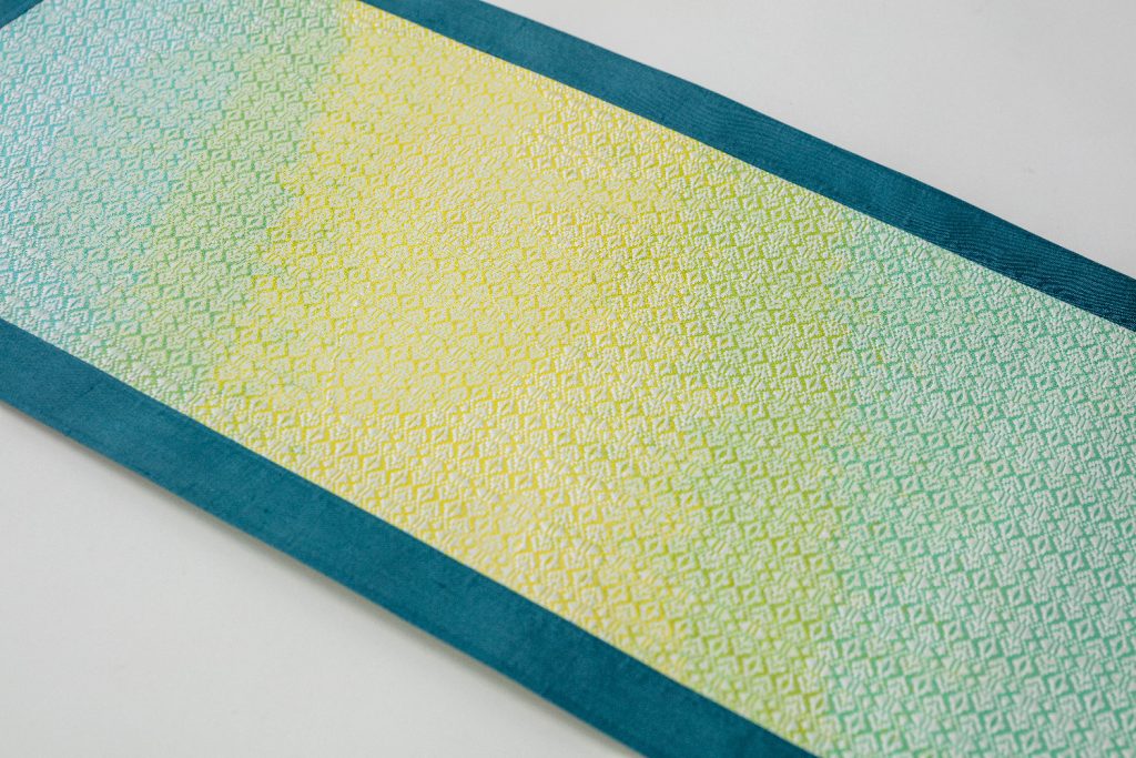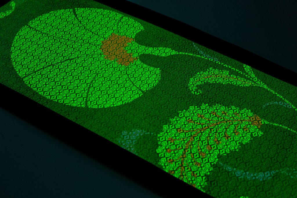 300年以上の歴史を持つ博多織の技法をベースに、ジャガード織と蓄光・再帰性反射素材を組み合わせ、光によって表情が変化する新しいテキスタイル表現に取り組みました。